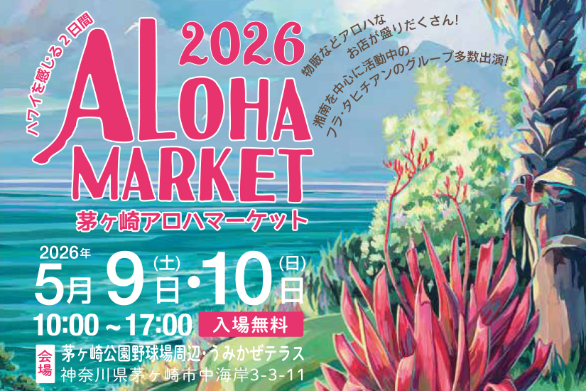 «イベント情報茅ヶ崎の初夏を彩る恒例イベント「茅ヶ崎アロハマーケット2026」が、5月9日(土)・10日(日)の2日間で開催されます。会場は茅ヶ崎公園野球場周辺とうみかぜテラス。ハワイアンな雰囲気に包まれながら、雑…
