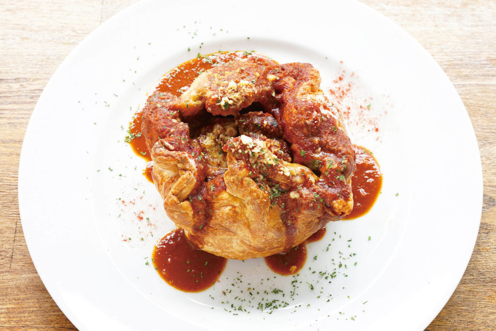 サクサクのパイ生地の中には、肉や野菜がぎっしりと詰まっていてボリューム満点。素材の旨みがすみずみまで行き渡ったパイは、オーナー特製ソースとの相性も抜群だ。
