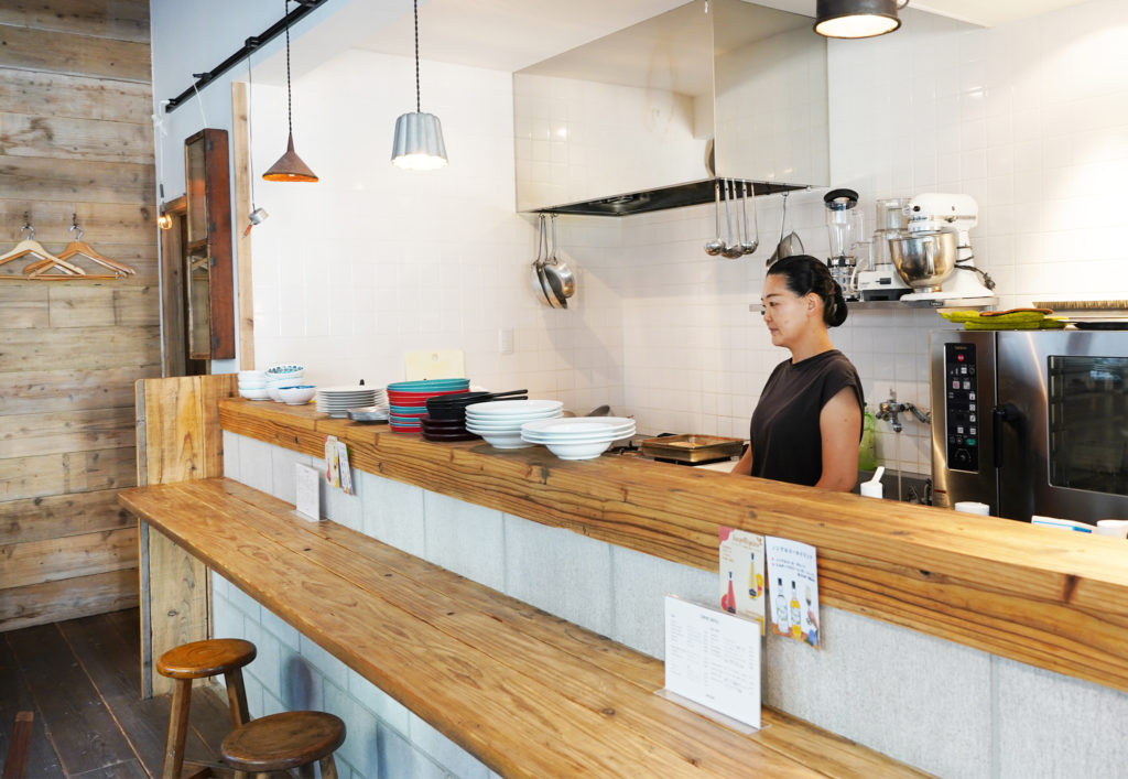 木の質感を生かした店舗には、緑豊かな中庭が見えるテーブル席と雰囲気のいいカウンターが。キッチンのタイルや木目調の壁、カウンターのコンクリート部分はオーナーが大工さんと一緒に仕上げたものだそう。