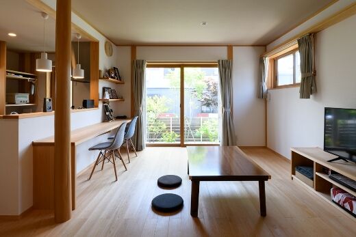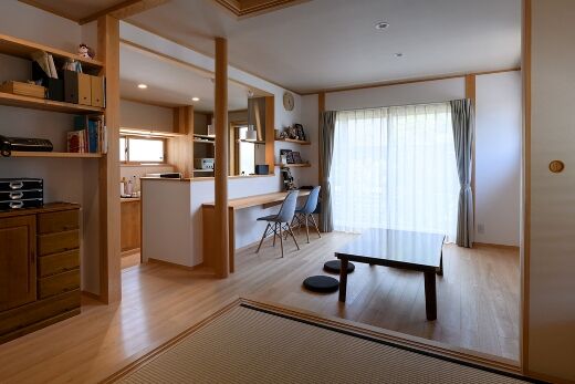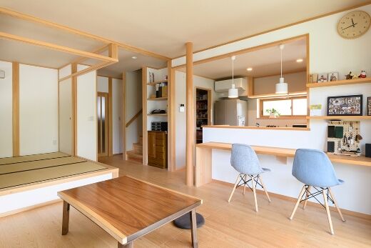 建て主の希望は床座の暮らしで、ソファーやダイニングテーブルを置かない「床座リビング」の家ですが、個食に備えてキッチン対面にはダイニングカウンターも設けました。小上がりの和室はリビング空間の広がりを生み、泊り客にも対応できます。床座の場合、立っている人が見下ろす形になってしまうので、キッチンの床を下げて目線の違いを緩和しました。