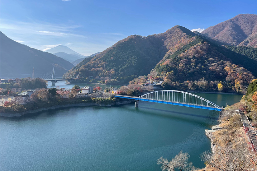 第1展望台からは、弓なりのアーチが特徴の大仏大橋や、丹沢湖のシンボル的な永歳橋が眼下に望めます。もう少し高いところにある第2展望台からは、富士山や丹沢湖周辺の山並み、そしてエメラルドグリーンの丹沢湖と色づいた紅葉のコントラストが見渡せて、まるで絵に描いたようです。