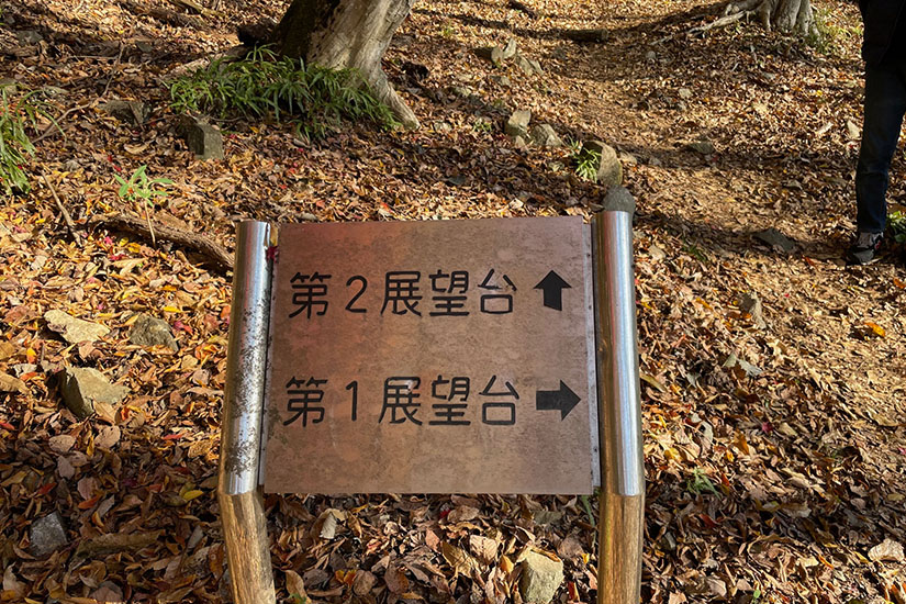 遊歩道入り口から階段や山道をぐぐっと上り、第1展望台と第2展望台の分岐点へ。