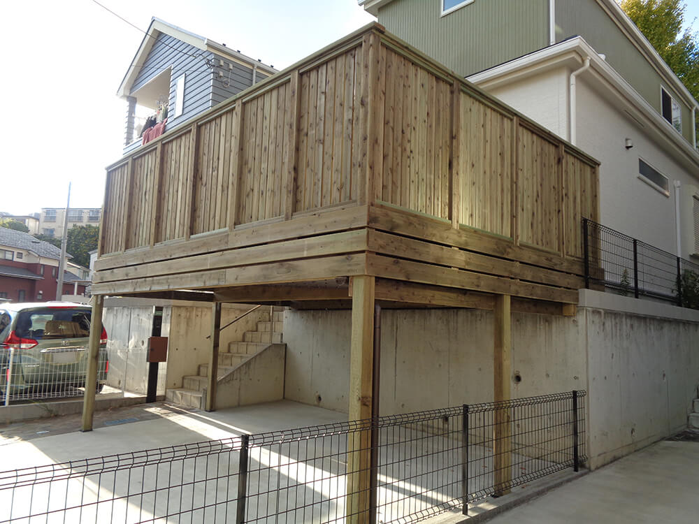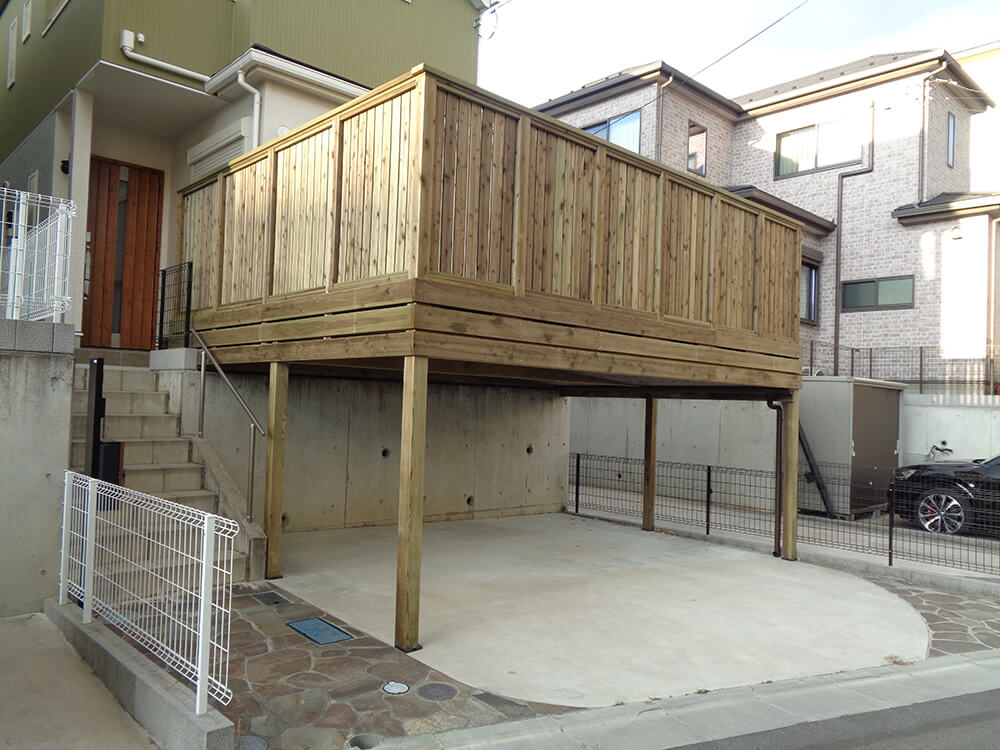 駐車場は必要だけど、庭もほしい!敷地有効利用の車庫上ウッドデッキのご依頼です。