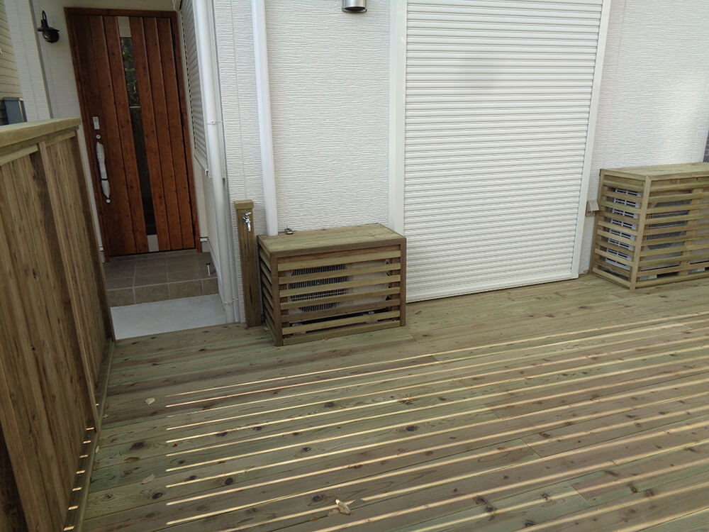 エアコン室外機を木で囲い全体がウッディな仕上がり!