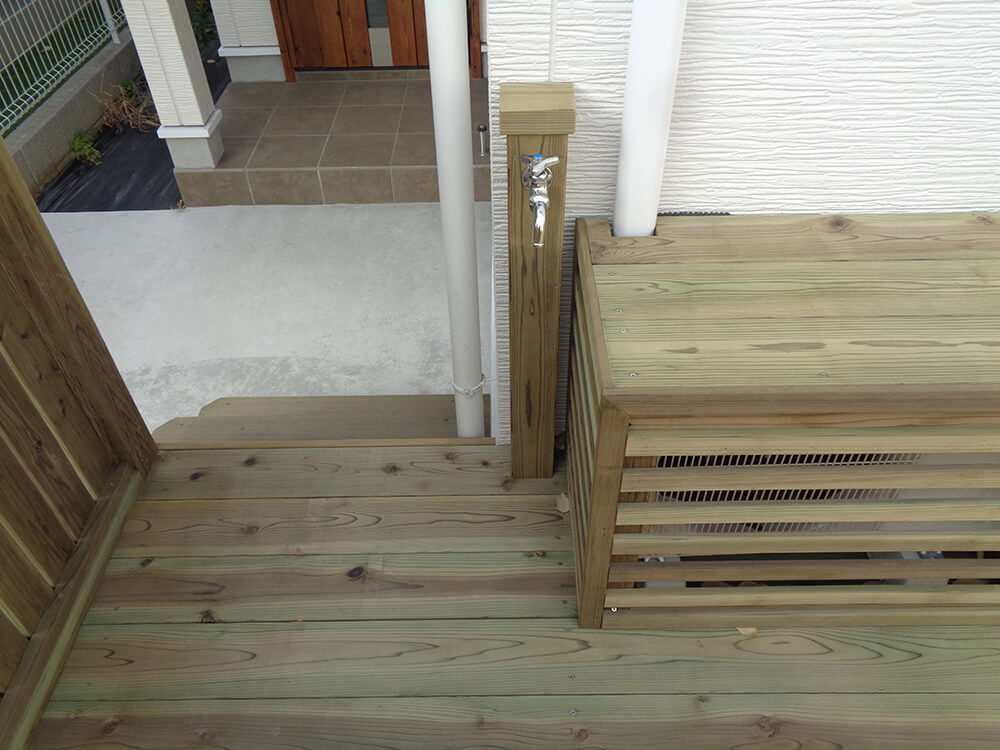 既設散水栓よりデッキ上へ水道を移設、立水栓を木材で囲いました。