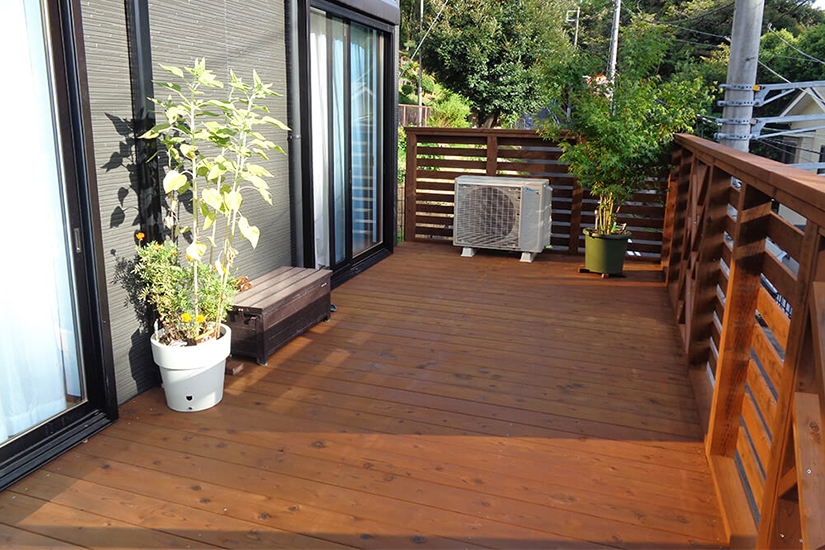 2つの掃き出し窓からつながるウッドデッキは広さ約19㎡です。
