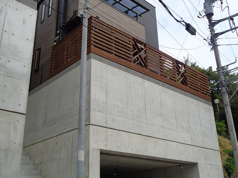 擁壁の上に建つD様邸。広いお庭にウッドデッキのご依頼をいただきました