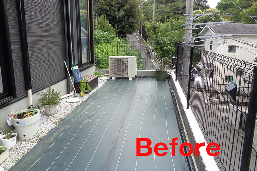 既設メッシュフェンスを撤去し、天然木フェンスでコの字に囲いました。