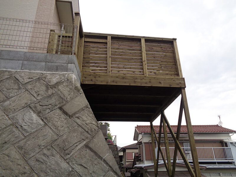 擁壁下まで土地を有効利用した傾斜地ウッドデッキ工事のご依頼です。