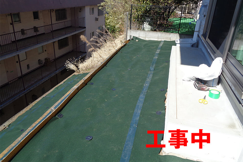 既設のワイヤーフェンスを撤去し、斜面部分まで防草シートを敷きました。