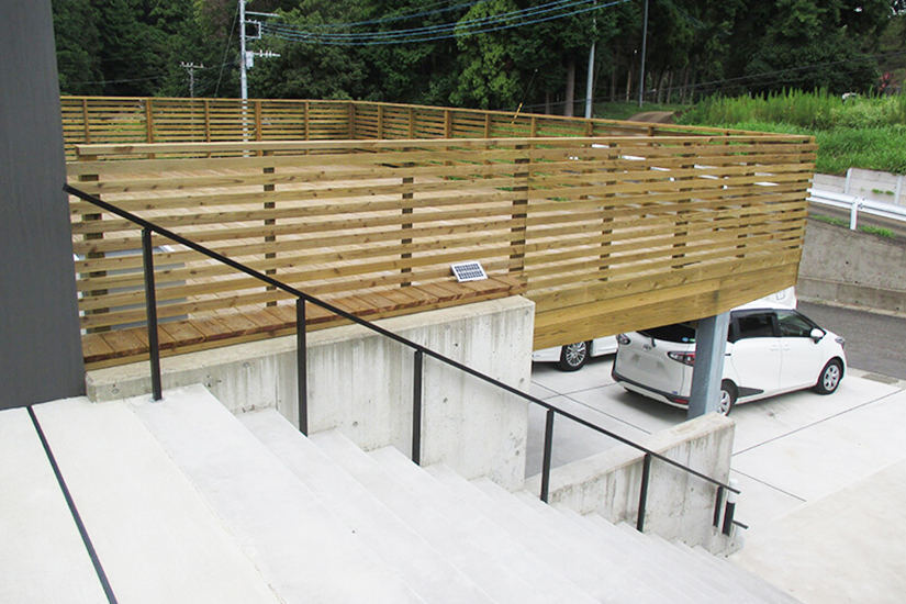 段差のある敷地に玄関よりすぐ利用できる広いウッドデッキができて大満足です。