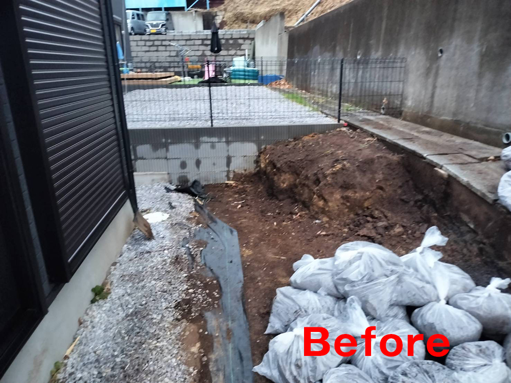 外構業者様の方で整地・砂利敷き後ウッドデッキの工事に入っています。