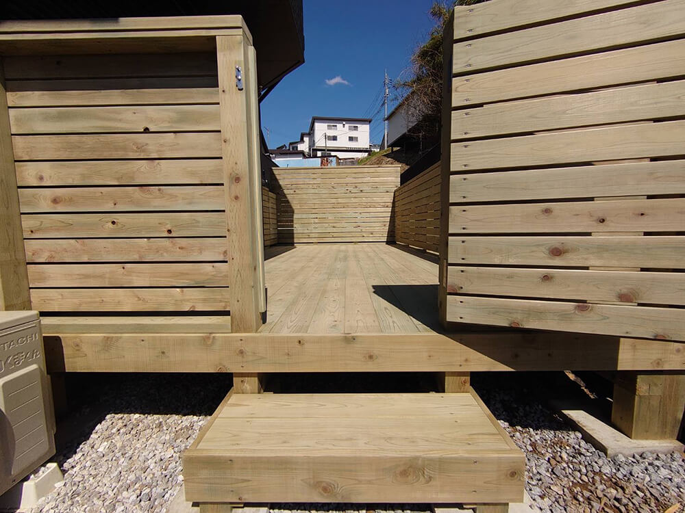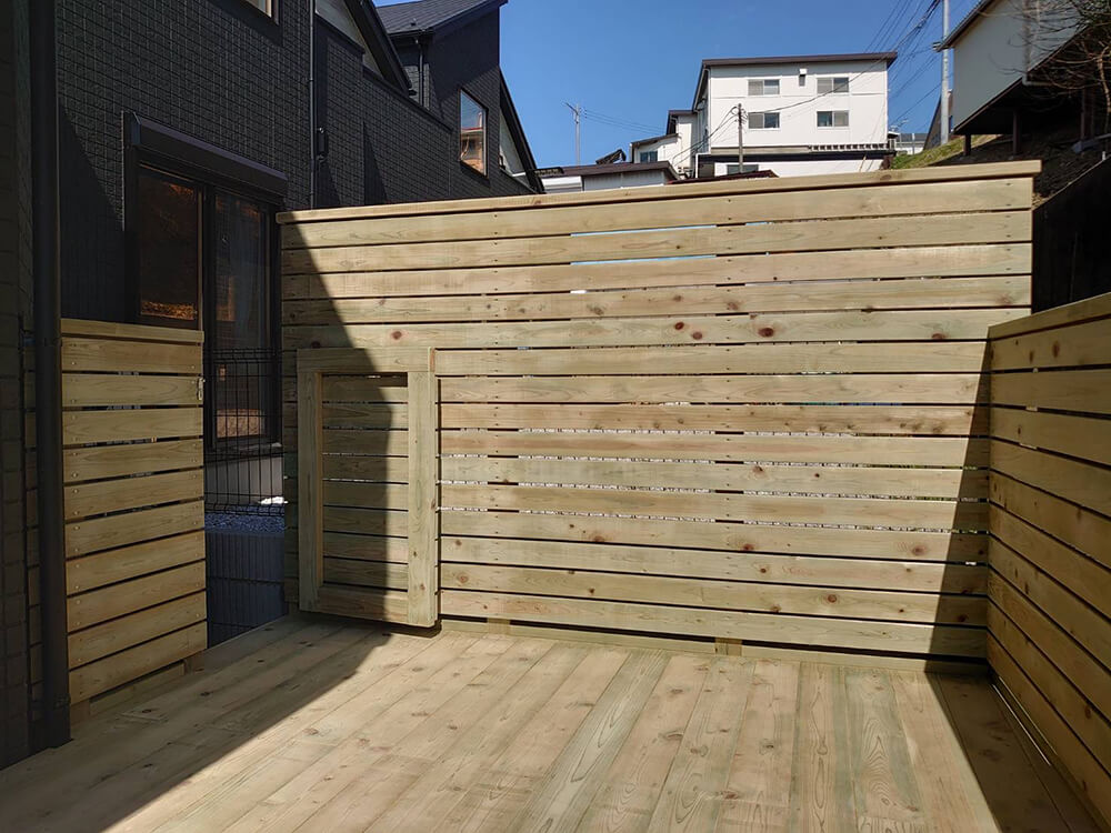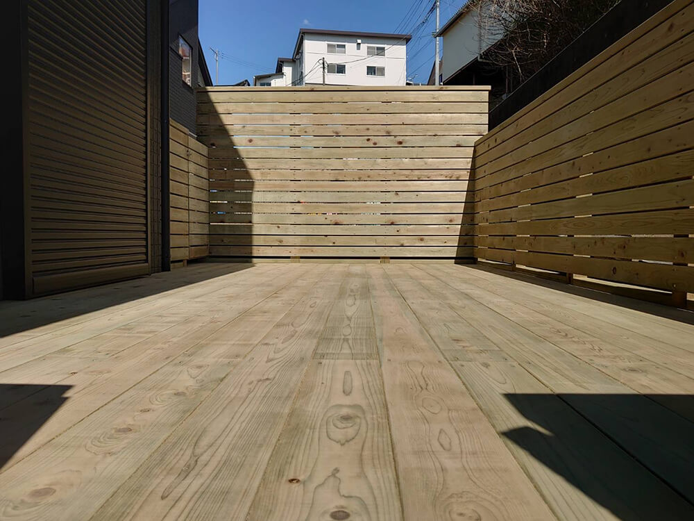 二つの掃き出し窓からフラットで出られるウッドデッキに、隣家の境界と前面の擁壁を目隠しフェンスで囲うプランです。
