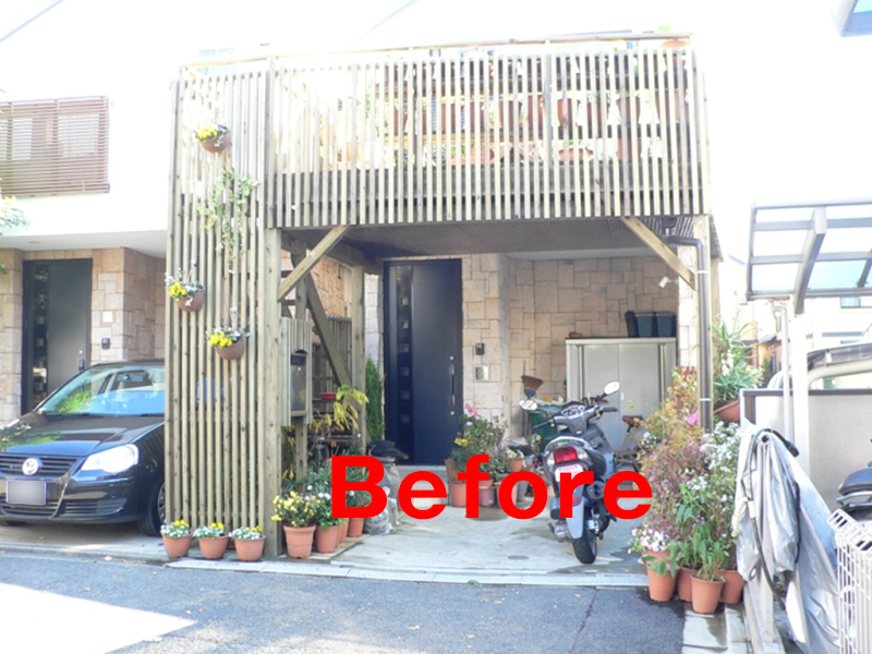 弊社で工事をした階段付き車庫上ウッドデッキが約10年経過し、ライフスタイルも変化したためカーポートへ造り替えのご依頼です。