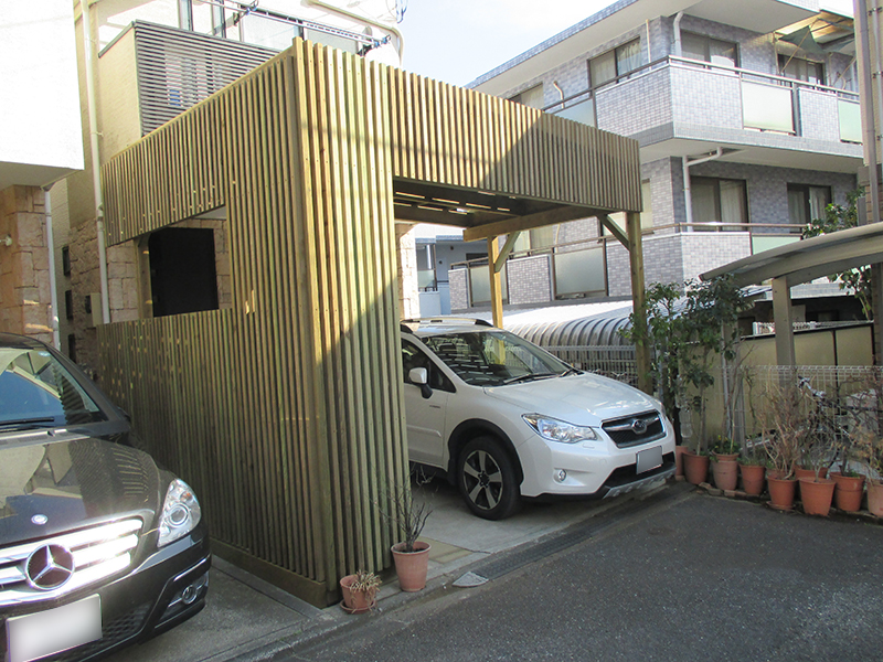 木材は自由にデザイン設計できるのも魅力のひとつ。既成のアルミカーポートにはない我が家だけの国産天然木オリジナルカーポートの完成です。