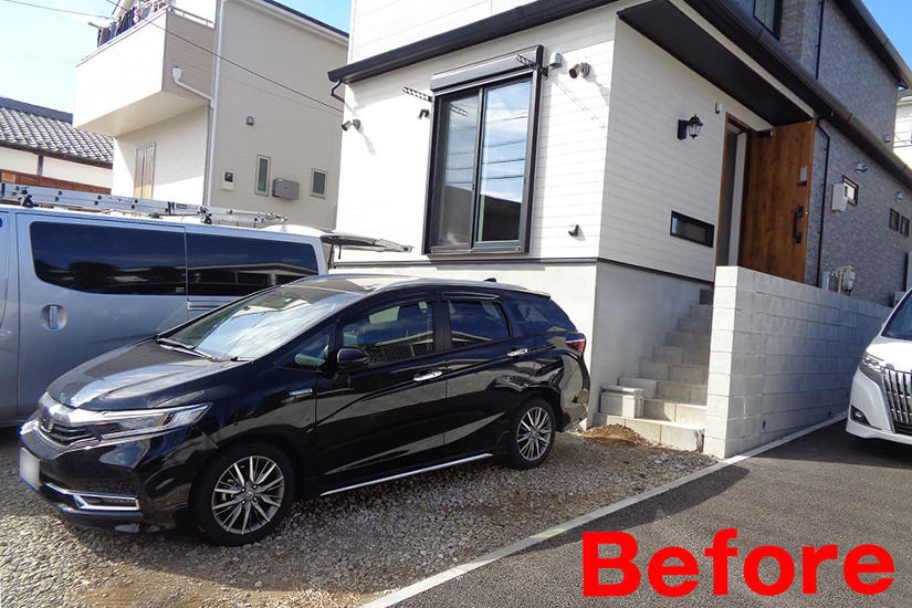 ご新築のD様邸。高さのある掃き出し窓で洗濯物が干しづらく転落の危険もあるため、フラットで出られるウッドデッキと目隠しフェンス工事のご依頼です。