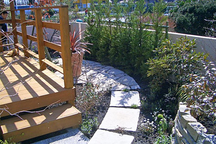 ジャスミンの壁とバラのトンネルを抜けると、曲がりを持たせた園路と高さに変化を付ける石積み。