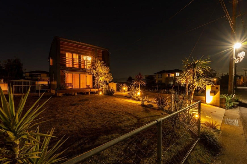 アメリカンフェンスと植栽を施しました。夜は各樹木の下からアップライトを照らし間
