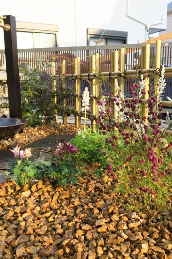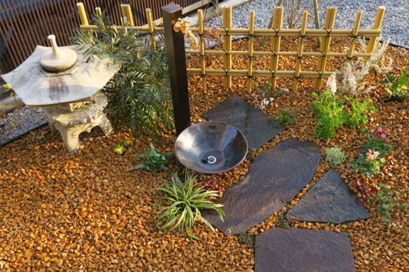 二枚の竹垣のみで空間を作り出すためにレイアウトを工夫しました。草むしりの