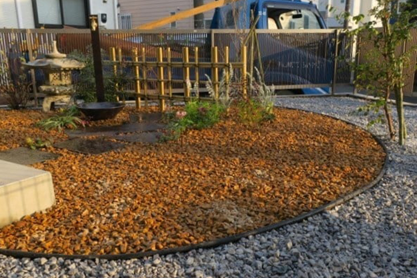 負担を減らすため土の部分は全面防草シートを貼り、化粧砂利敷きとしました。