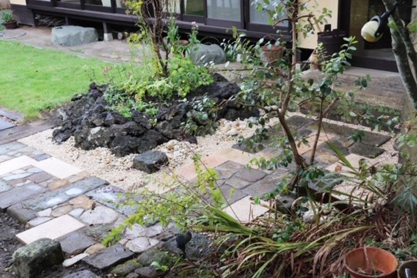 ご連絡を受けお客様のお庭に伺うと、鎌倉石と枕木でつくられたとても雰囲気のよい空間が広がっていました。