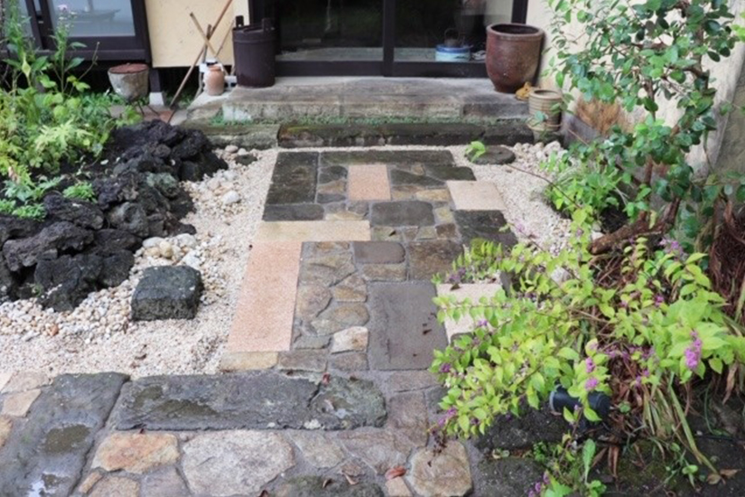 そこで木曽石とミカゲ石を追加し、玄関までの動線を改善する延段風のアプローチを作成しました。メンテナン