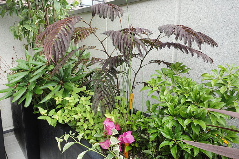 色もシンプルな黒で統一し、高木や低木、草花類で限られたスペースの中、立体的に緑を組合せ、