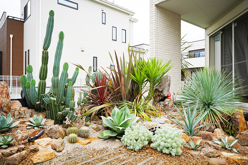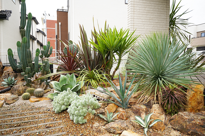 背の高いサボテン、小さな多肉植物とバランスの美しく、恐竜のオブジェが遊び心をプラスしてくれるストーリー性のある庭が完成した。