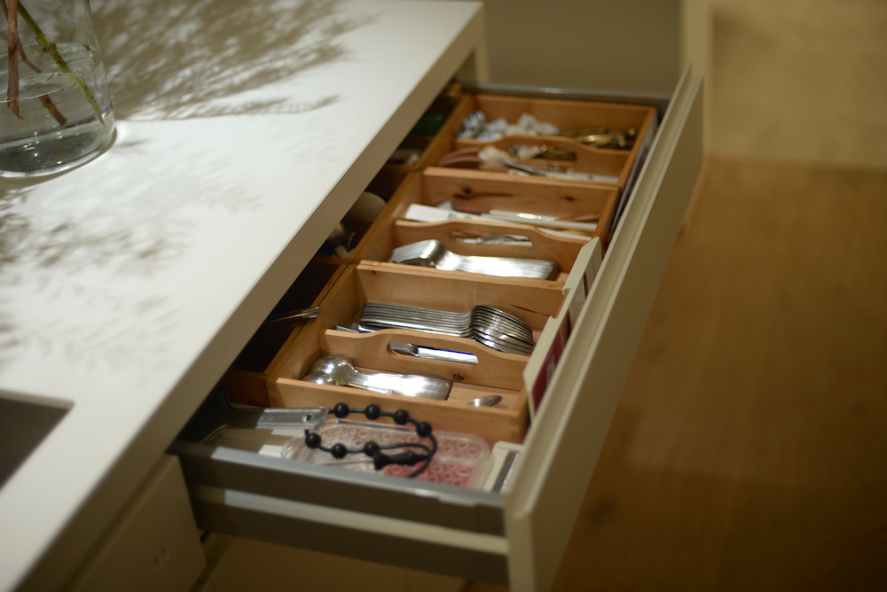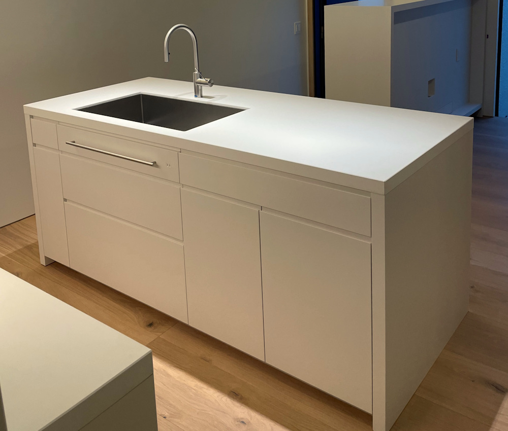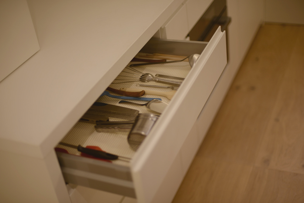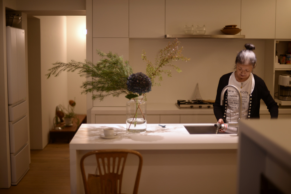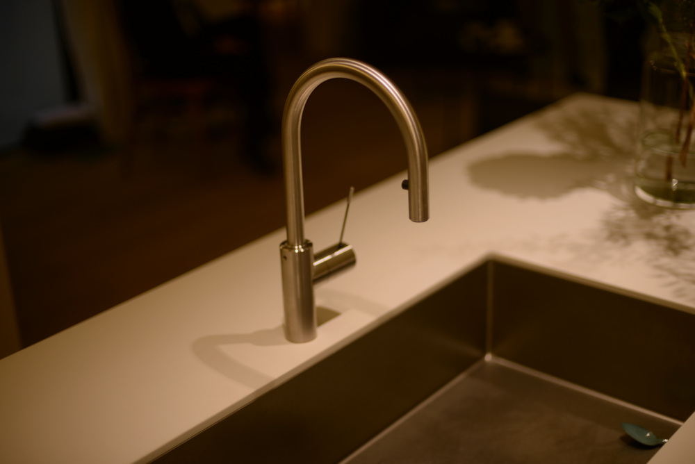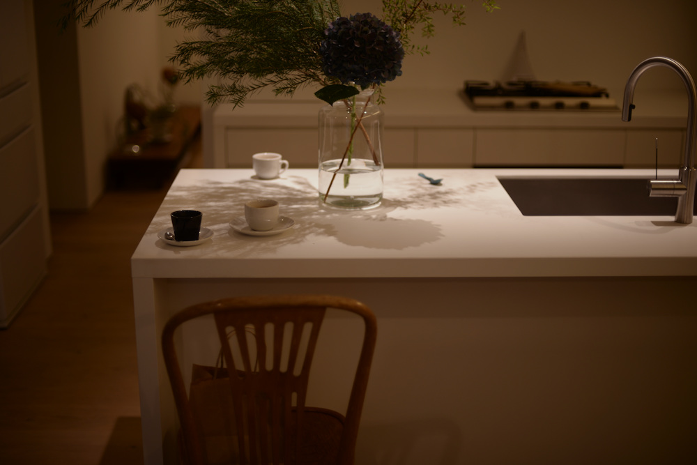 アイランドキッチンの天板には、クォーツのビコストーンを採用し、このカラーもキャビネットの仕上げと同じく少しくすんだホワイトを選び、また壁全体も同色で仕上げることで、キッチンそのものを空間に表現するのではなく、あくまでここはキャンバスであって暮らす日々の移ろいがこの場所に美しく表現されるキッチンに仕上がったのでした。