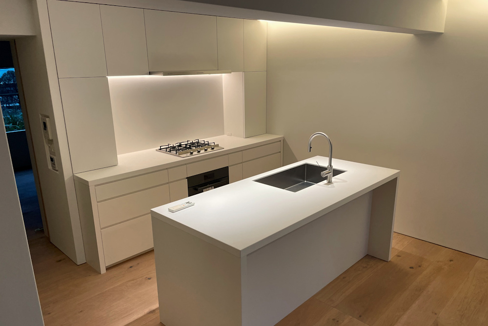 上質な空間を作り上げるMA設計室の福原さんと作り上げた白く美しいキッチンです。