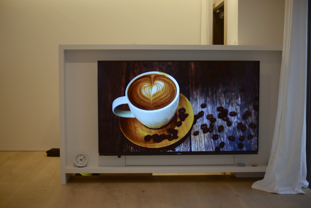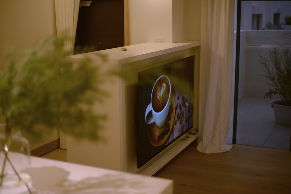 ウレタンホワイト塗装仕上げのセパレートキッチンとテレビボード