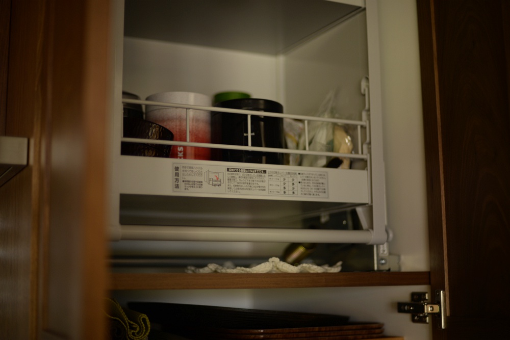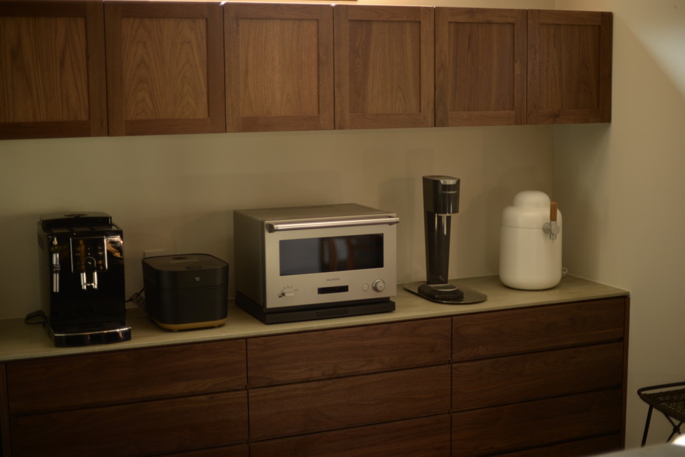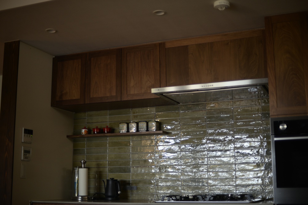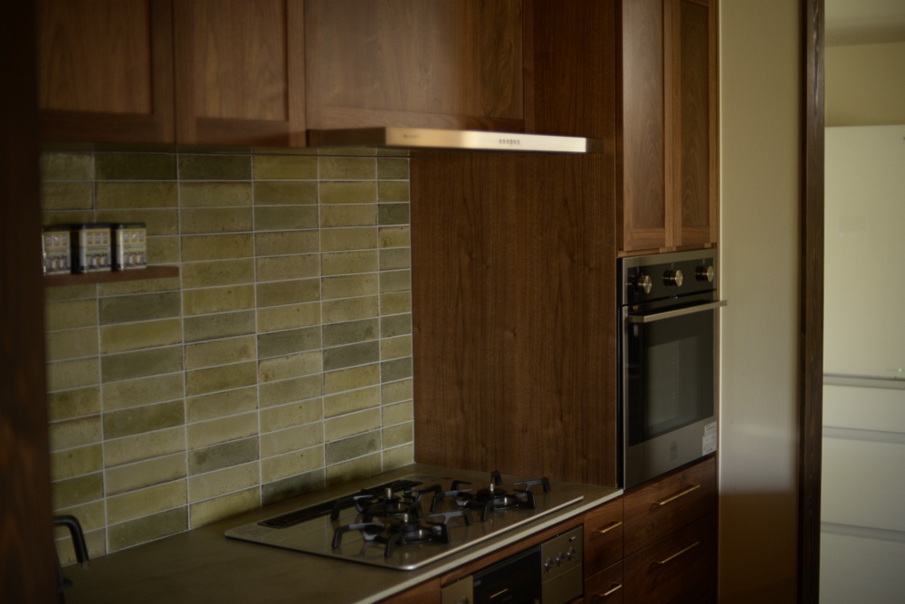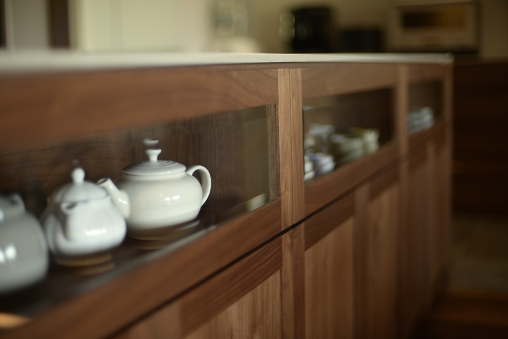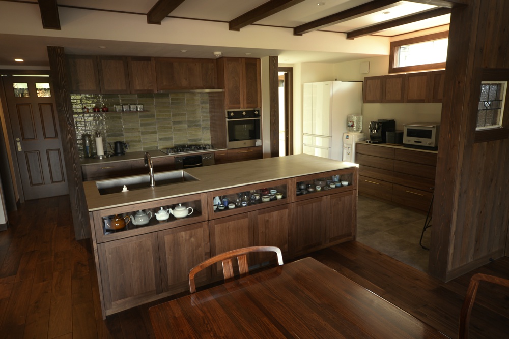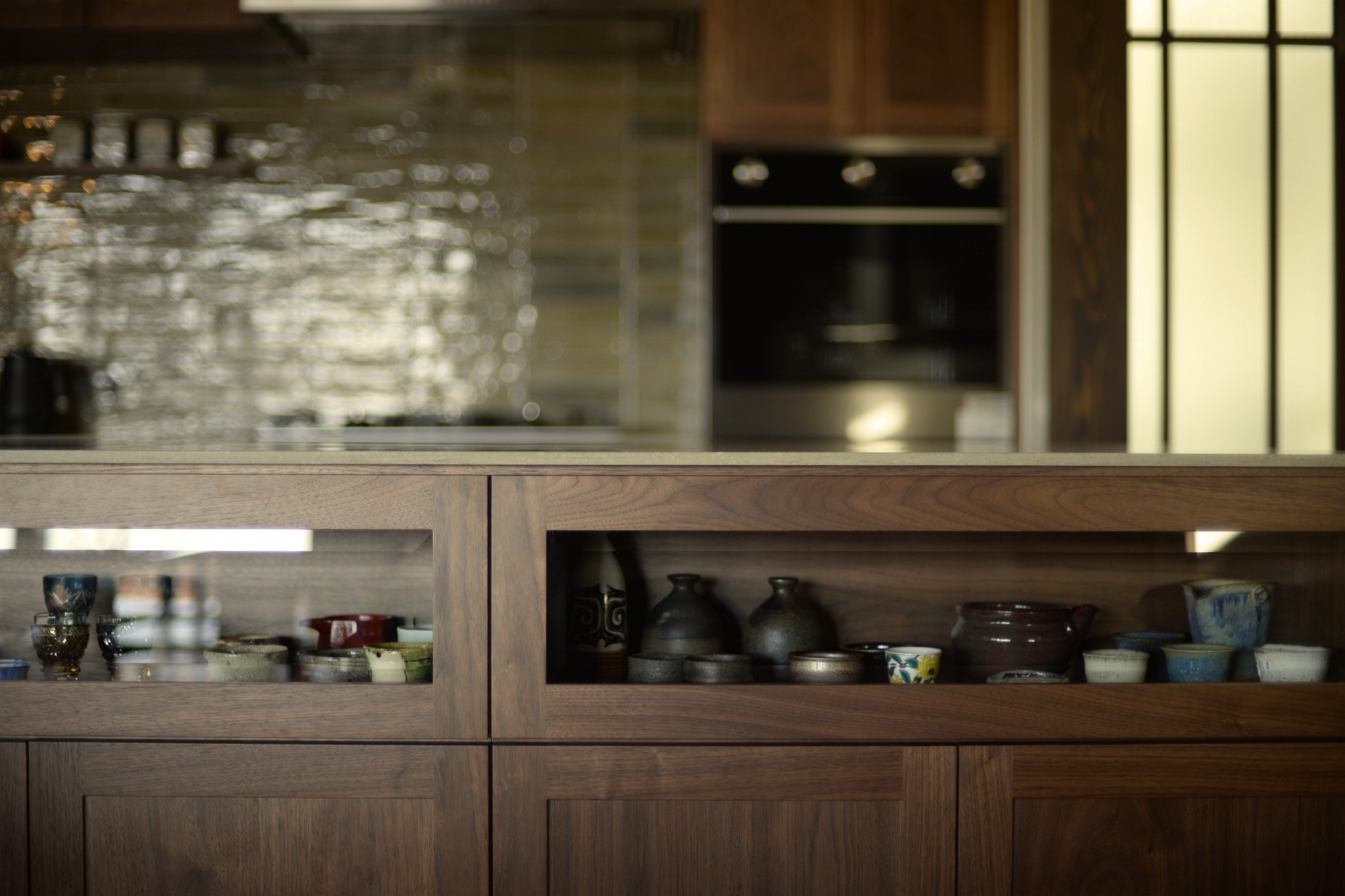 コーリアンとブラックウォールナットのセパレートキッチンとカップボード