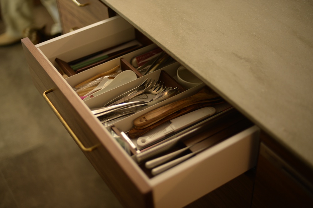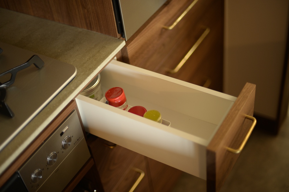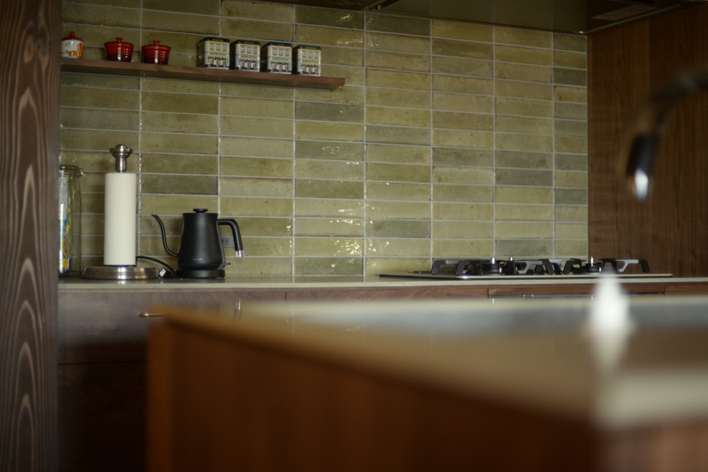 表面材はブラックウォールナットを用いて、天板にはコーリアンの少しグリーンのカラーが入ったセージブラッシュというシートカラーを選んでいます。