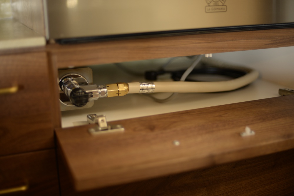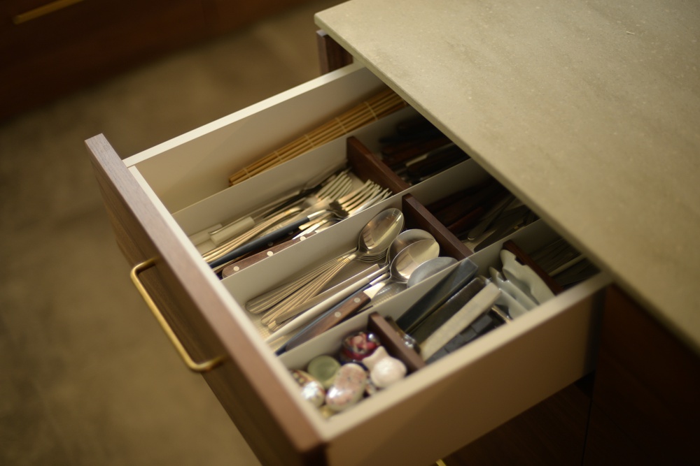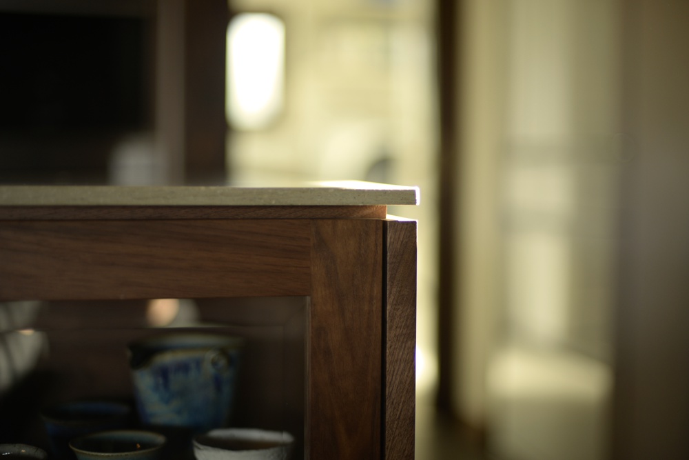 全体的にウォールナットの落ち着いたカラーにまとまっているのですが、決して重い空間ではなく、外からの明るい日差しが望める空間だったからこそ実現できた素材使いだと思うのです。