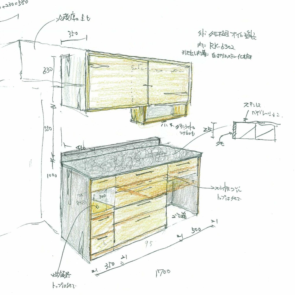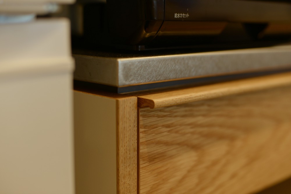 天板はステンレスバイブレーション仕上げで、印象を軽く見せるために濃い色で仕上げた目地材を入れてフロートタイプにしています。