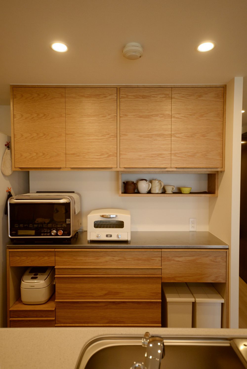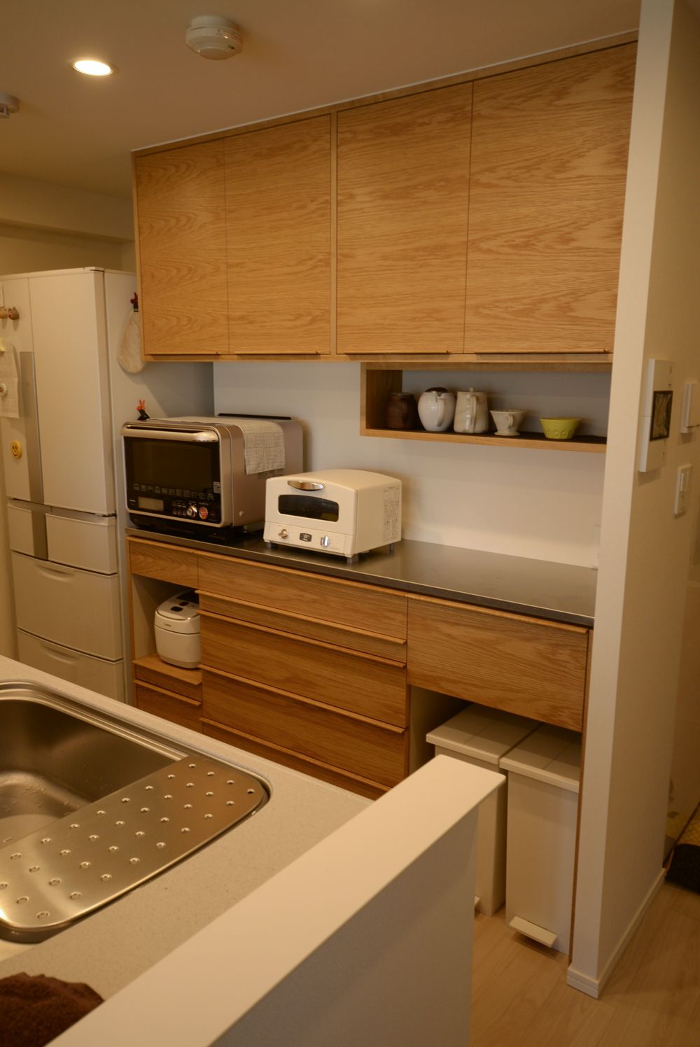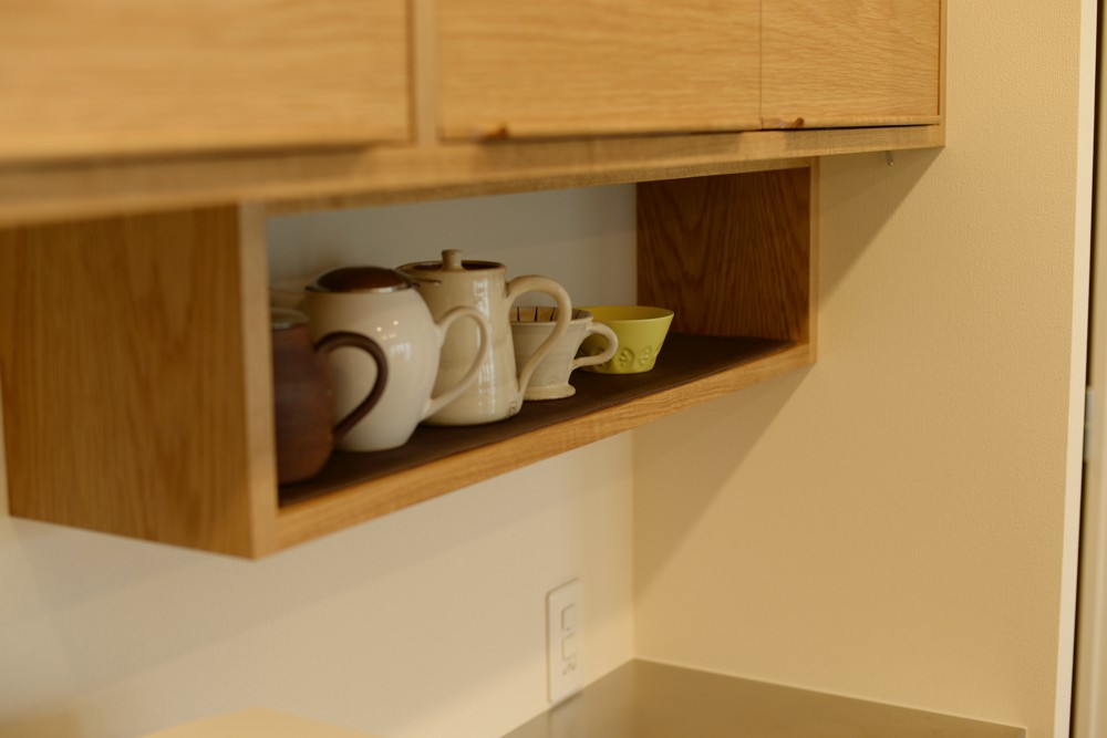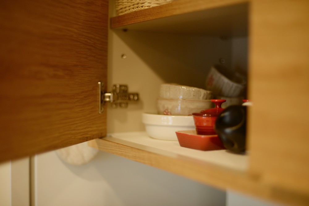 マンションのキッチンに作りつけたナラ板目材を使った食器棚。