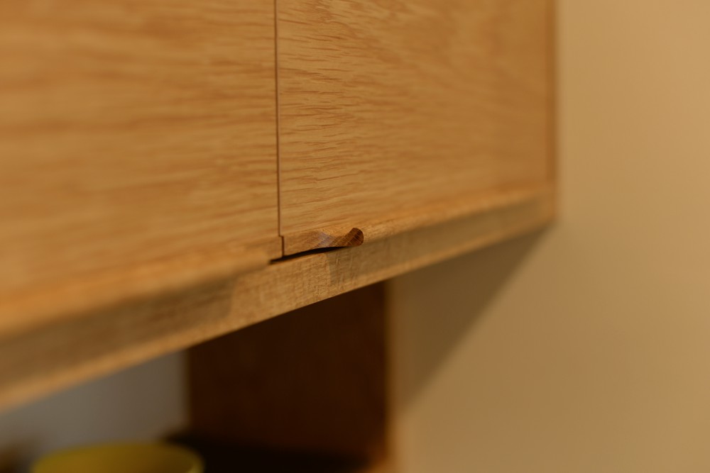 出っ張らせた下面にくぼみをつけることで開けやすくしているのですが、その先端に丸みをつけて手触りよくすることで、デザイン的には海外で見かける上品な印象の食器棚のような形に仕上がりました。