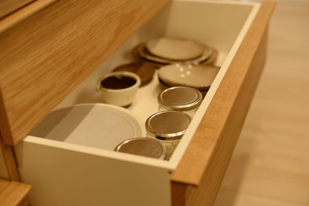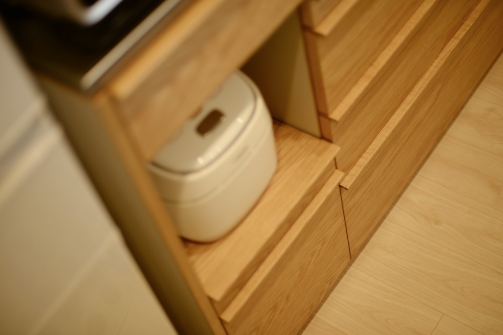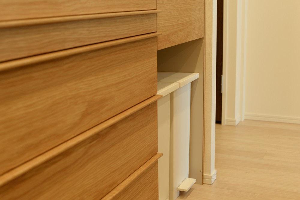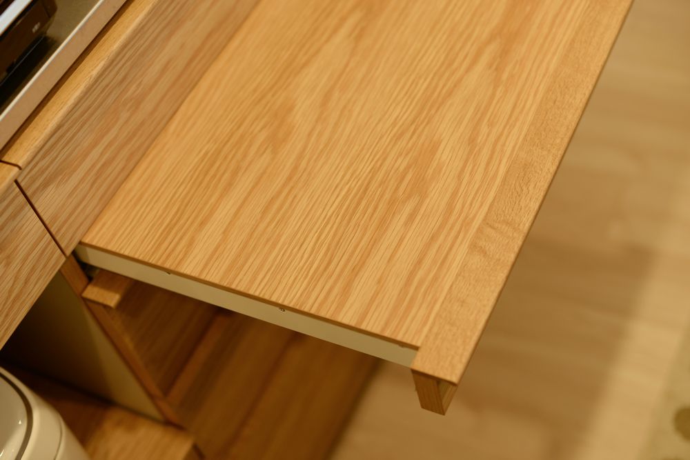 また、表面をすべてナラ材で仕上げるのではなく、内部をグレージュのポリエステル化粧板を使うことで、軽やかな印象になっています。