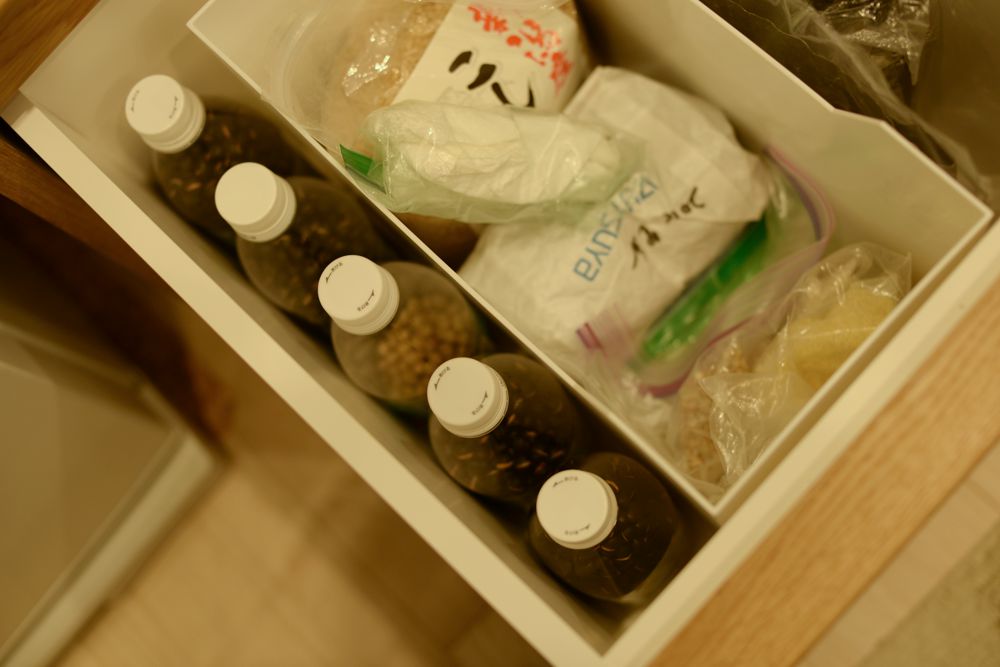 ナラとグレーのポリとステンレスの食器棚