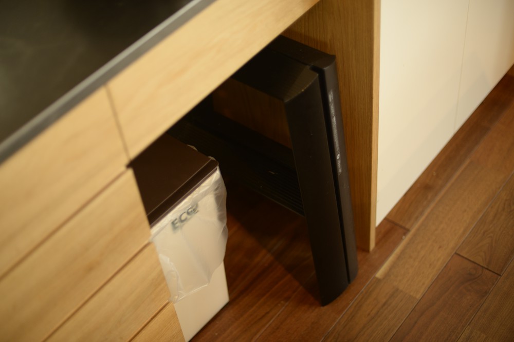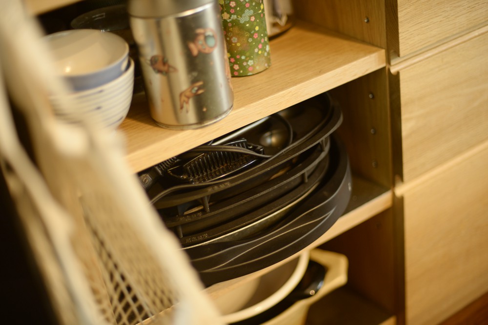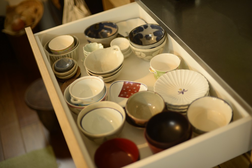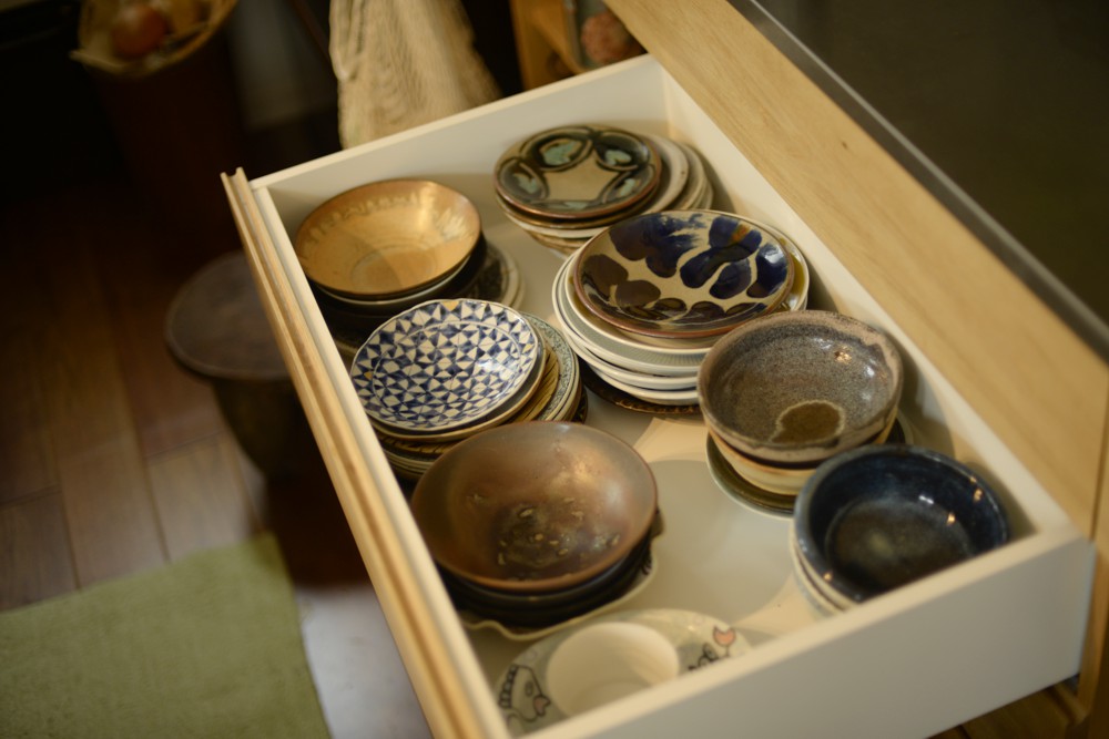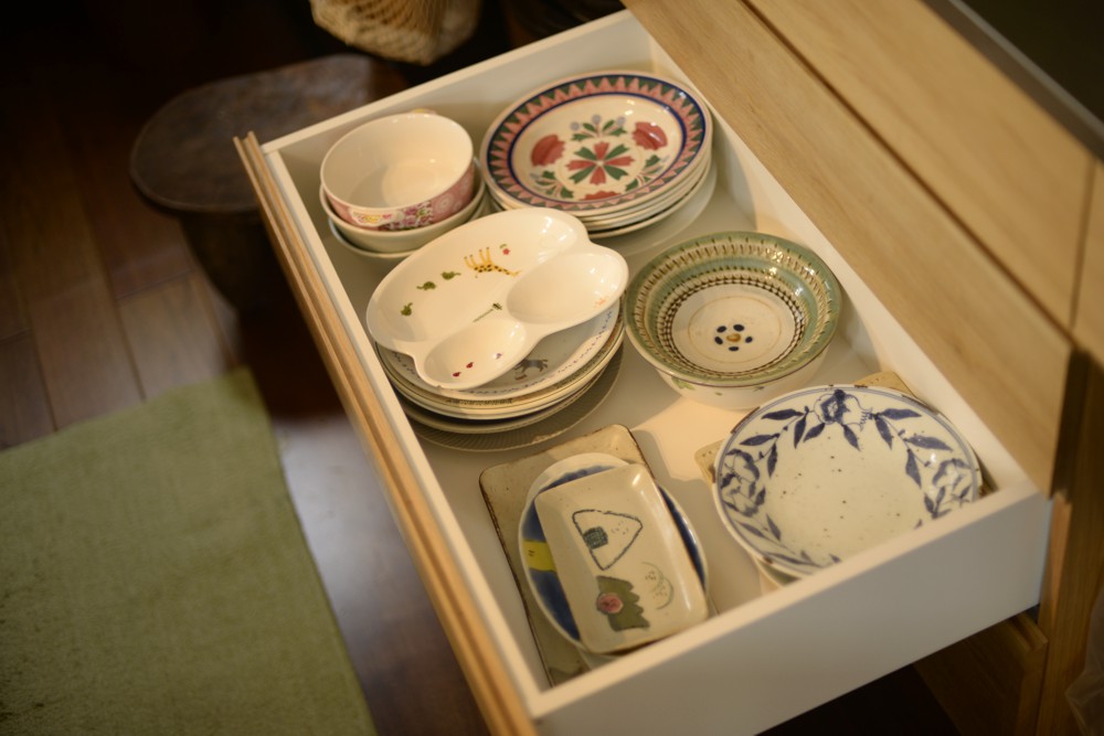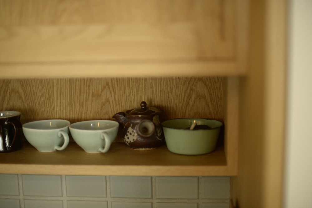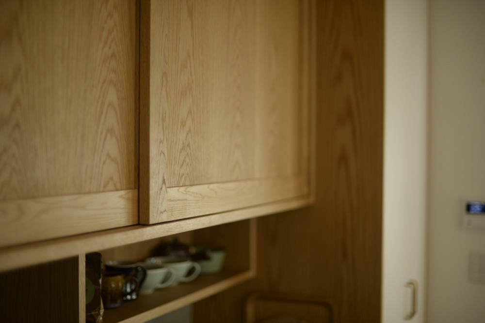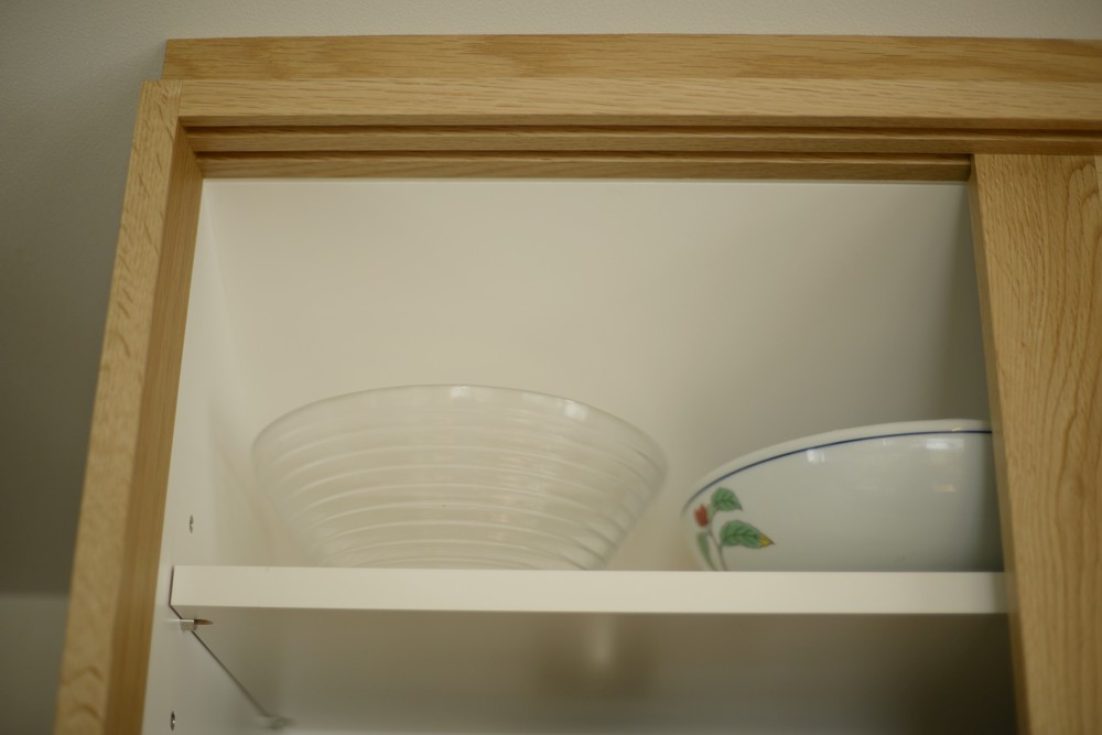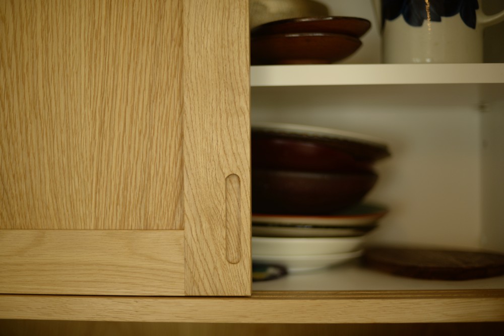 ただ、こちらのキッチンの間取りは2階の屋根勾配がキッチンに表れているというちょっと変わった空間でした。ここに普通の食器棚を制作するのではかえってデコボコした印象がより際立ってしまう、ということに思い当たりまして、勾配に合わせて食器棚を作ることにしたのです。