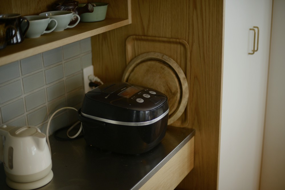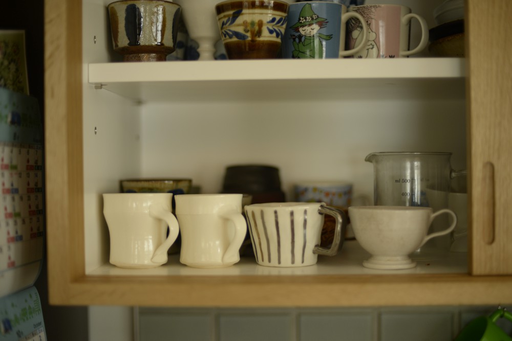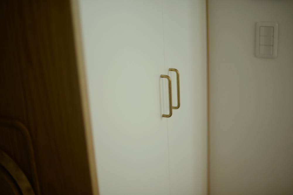 パントリーはすっきり見せるためにホワイト真鍮の組み合わせて、食器棚はナラ材の優しい表情を生かしてどこかフレンチシャビ―な印象を持つ食器棚ができあがりました。良い色です。