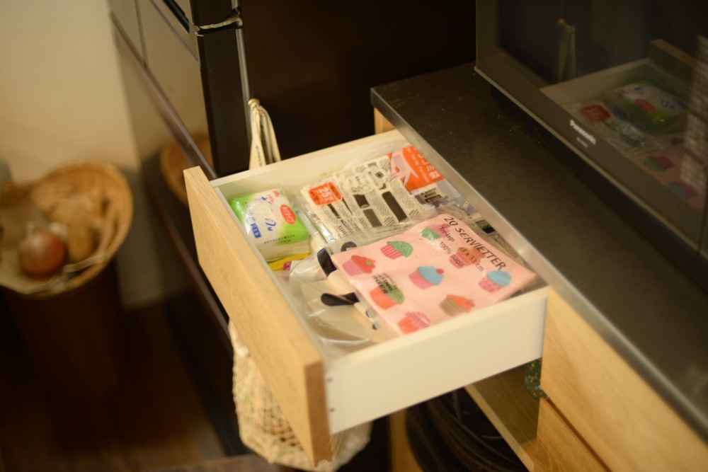 そこで、吊戸棚は引き戸で、パントリーは開き扉で