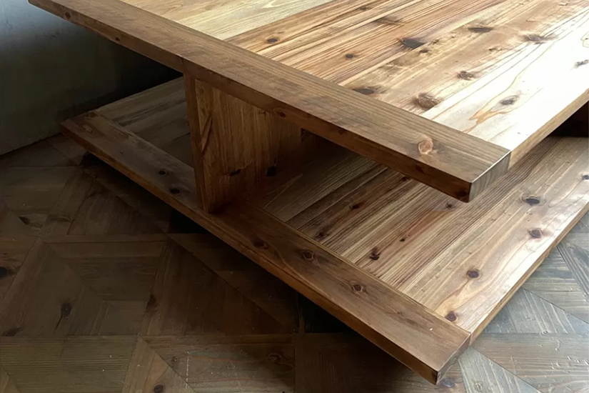 杉はとても柔らかい木材で、キズが付き易く、短期間でまるで長年使用していたようなアンティーク感を出すことができ、色味も年月と共に多少変化します。