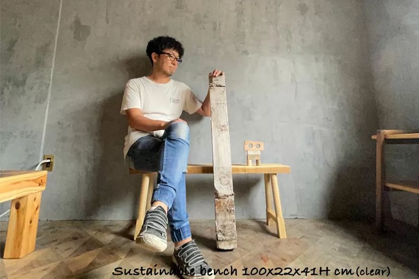 重機で解体して傷ついてしまった柱から製作してもサマになるのがこのベンチの強みです。