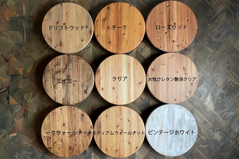 クリア(¥32,800), ミディアムウォールナット(¥32,800), ダークウォールナット(¥32,800), エボニー(¥32,800), ドリフトウッド(¥32,800), チーク(¥33,800), ローズウッド(¥33,800), 水性ウレタン艶消クリア(¥34,800), ビンテージホワイト(¥35,800)