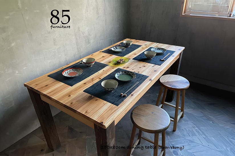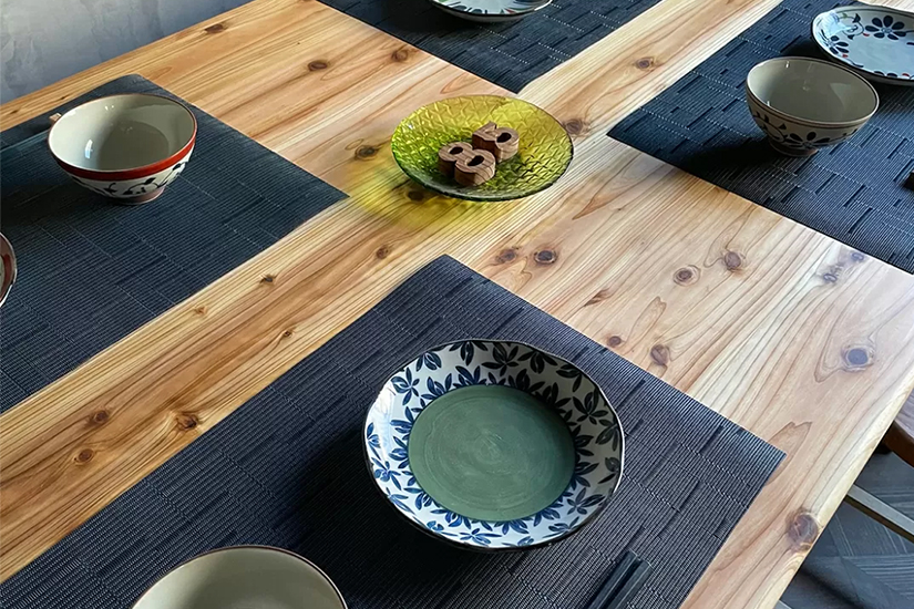 国産杉無垢材をオイル塗装で仕上げたとても柔らかな手触りのダイニングテーブルです。