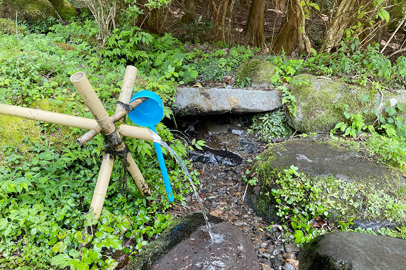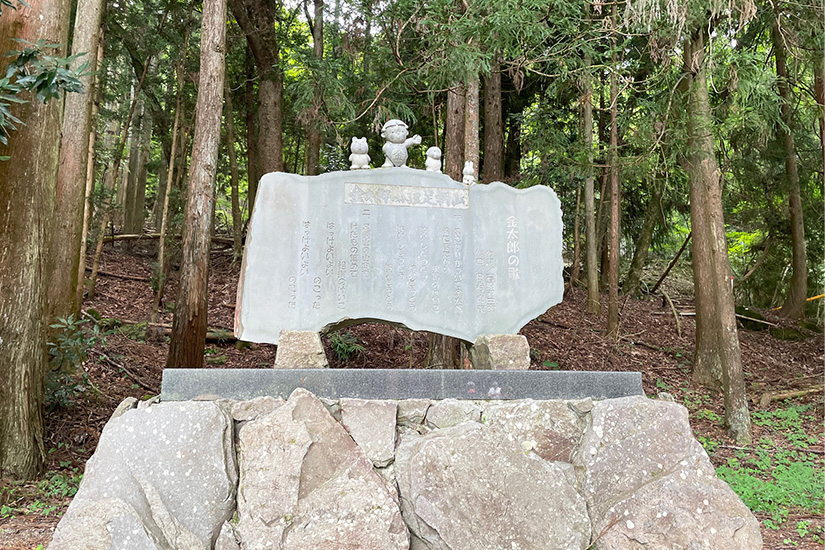 小さな橋を渡った先にある夕日の滝広場には、童謡「きんたろう」の歌碑や、「金太郎の力水(ちからみず)」と名付けられた水飲み場があります。この水は、滝近くの湧水を浄水したもので、看板によると硬度を示すカルシウム・マグネシウムが1ℓ当たり41㎎の軟水で、pHは7.7で弱アルカリ性。平均水温は14.8℃で真夏でもヒンヤリ。水汲み目的で訪れる方もいらっしゃるようです。