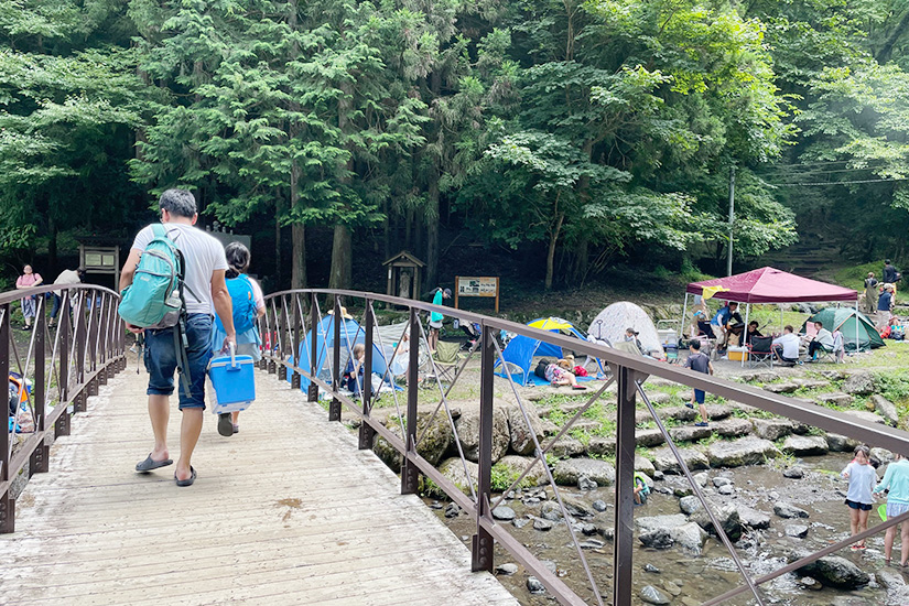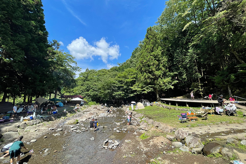 浅瀬の川では、子どもたちは水遊びに夢中です。足元をよく観察してみると、オタマジャクシや小魚の姿も見られます。川底は砂や石、岩があるので、かかとを固定できるサンダルはお忘れなく。