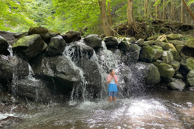 滝を彩る新緑・紅葉、厳冬期の氷結した滝しぶきなど、四季折々に異なる景色が楽しめますが、親子連れにオススメなのは夏の季節! ヒンヤリ冷たい川で思いっきり水遊びを楽しめば、最高の一日になること間違いなしです。