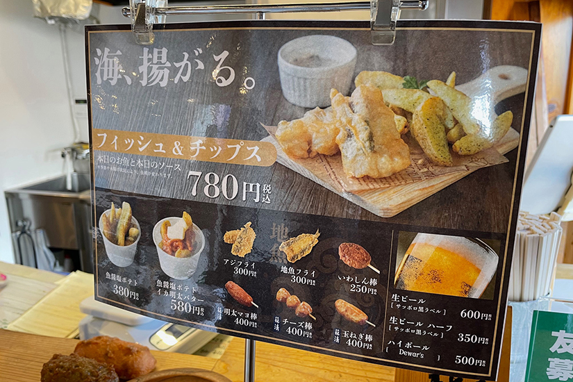 店頭では、魚職人が考案した地魚などを使ったフィッシュ&チップスなどのフードメニューも販売しています。作り置きをせず、注文を受けてから調理してくれるのも、魚の美味しさを追求する「小田原 崎次郎」ならではの心意気です。